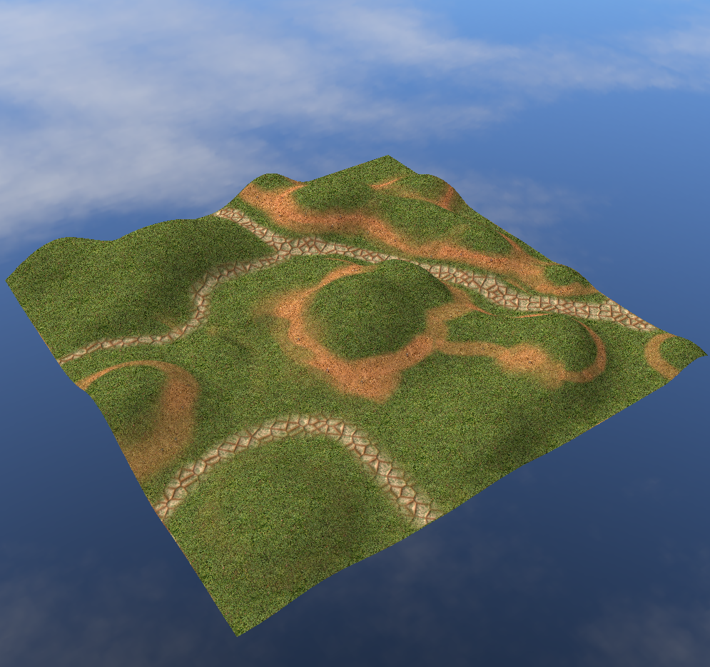 An attempt at implementing a texture blending system for terrain. This approach blends between 3 textures using weights stored in a base texture. In other words for each pixel in base texture, the R value refers to how much of texture 1 to use, the G value refers to how much of texture 2 to use, and so on. This is allows me to smoothly blend between 3 different terrain textures. The obvious limitation is that it only supports 3 terrain textures. Also that base texture might end up getting quite large depending on the size of the terrain, unless you break the terrain into cells. I have no idea if this is how it is handled in serious engines but it works well enough for me. In the end the fragment shader code is as simple as: